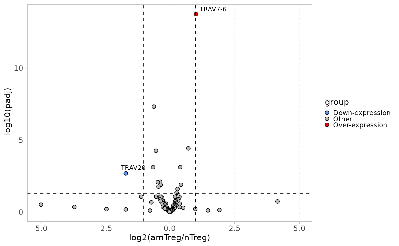 This function plots differentially expressed repertoire levels calculated using the diffExpGroup in a volcano plot.